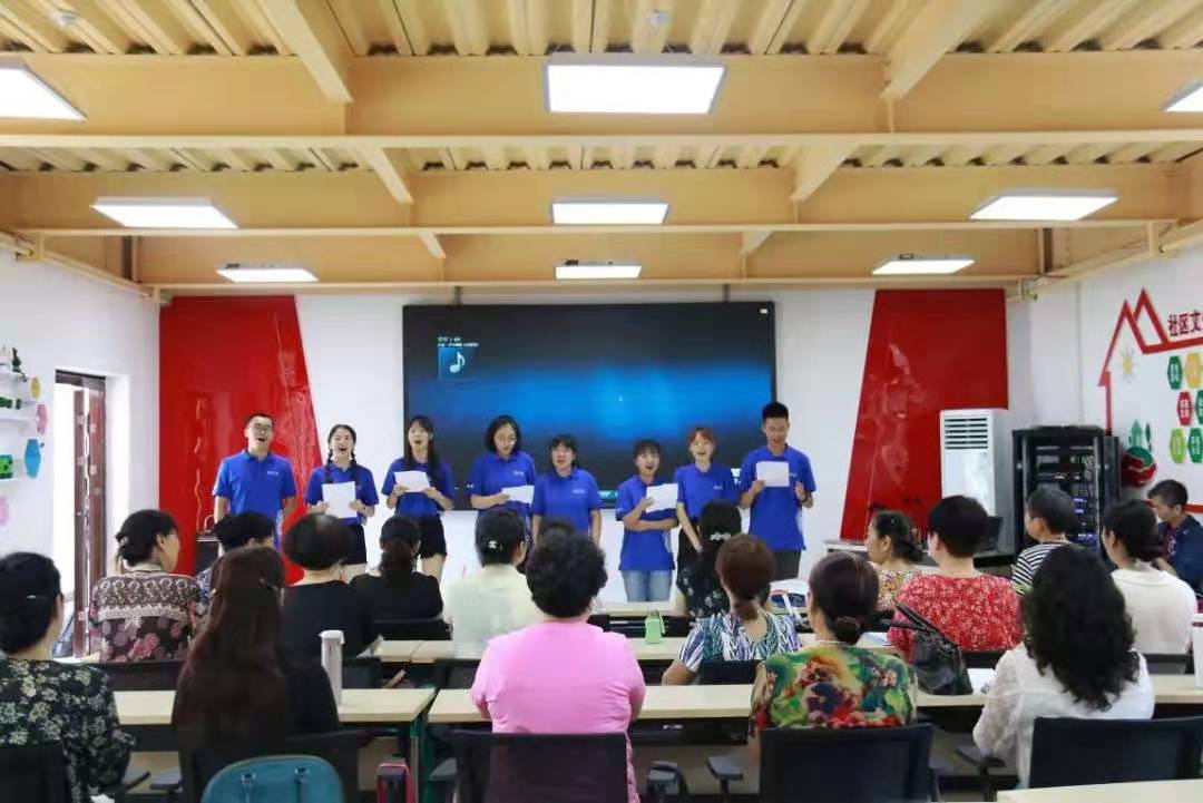 为丰富老年人的业余生活,传承红色经典,实践团开展了一场别样的经典红歌会。实践团首先演唱了著名爱国歌曲《我的中国心》,成功点燃了现场气氛。老年人们积极加入到我们的活动中,组成小合唱团演唱一首一首经典的红歌。之后,实践团与老人们在社区老年大学声乐教师的带领下,共同学习了歌唱技巧。